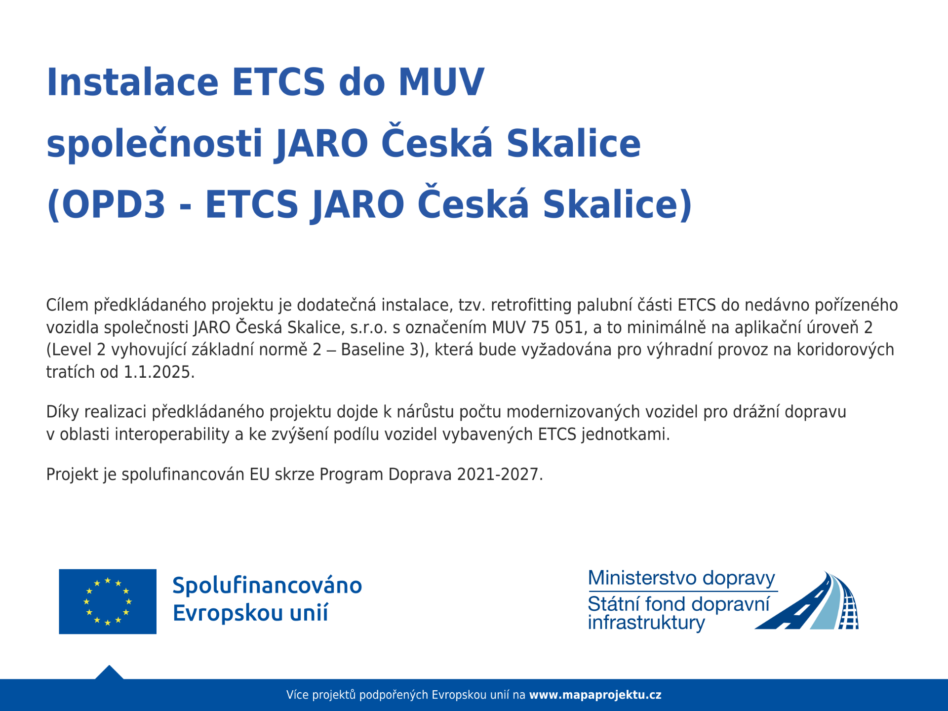 Společnost JARO Česká Skalice přispívá ke zvýšení bezpečnosti a interoperability železniční dopravy modernizací svého vozového parku. Všechna vozidla MUV 75 jsou vybavena zabezpečovacím systémem ETCS. V rámci projektu "Instalace ETCS do MUV společnosti JARO Česká Skalice" byl tento zabezpečovací systém úspěšně nainstalován i do vozidla MUV75 051. Projekt je spolufinancován EU.