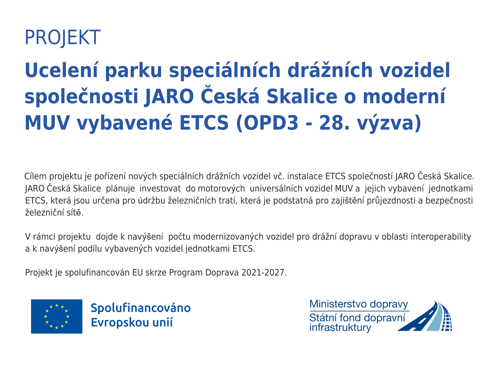V rámci modernizace našeho vozového parku připravujeme projekt "Ucelení parku speciálních drážních vozidel společnosti JARO Česká Skalice o moderní MUV vybavené ETCS (OPD3 – 28. výzva)", jehož cílem je nákup tří moderních motorových univerzálních vozidel (MUV) vybavených zabezpečovacím systémem ETCS.